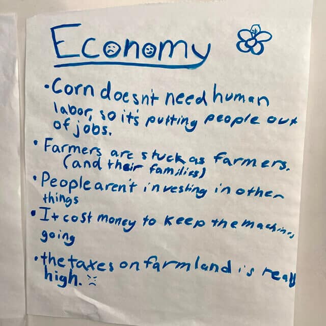 This fall in seventh grade social studies, students are learning about the food system. Using Michael Pollan’s Omnivore’s Dilemma as our guide, we are taking a closer look at the inner workings of the American food industry. Our focus started with corn and how it has risen to prominence as the dominant food crop in the United States. Students discovered that corn is so versatile that it can be found in many unexpected, even non-food, products, such as shampoo, matches, hand sanitizer, and bioengineered bone tissue! Our conversation then evolved into evaluating both the benefits and drawbacks of corn agribusiness. Students took time to look at the corn industry through the lens of our class’s “Sustainability Compass” and its four components: Nature, Economy, Wellbeing, and Society.