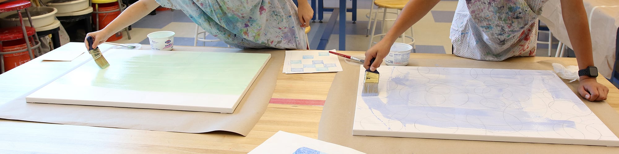 From our school counselor’s office across from the Downing gym to a hallway at 37 Day School Lane to the reading and resource rooms in the Erskine Library, a series of large, colorful paintings have been hung over the past few years. Each of the canvases is unique to the space, designed and painted by seventh and eighth graders in the Painting BIG! arts elective taught by Anne Armstrong, visual arts teacher and arts coordinator.
