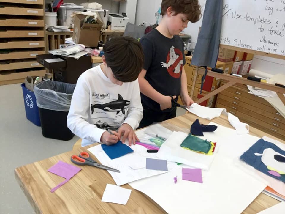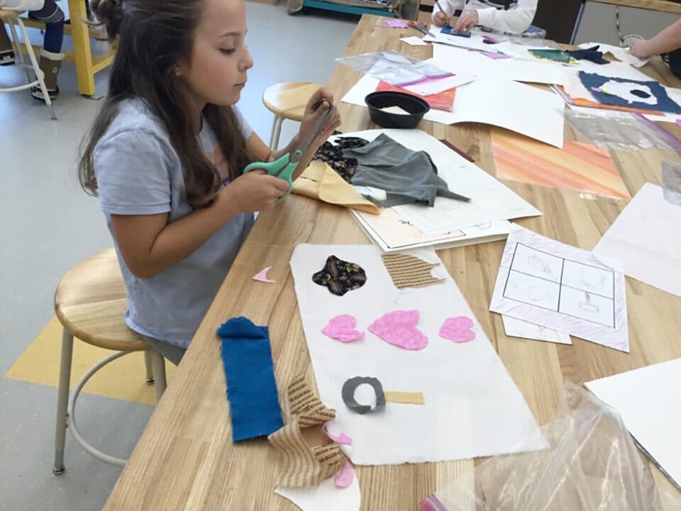 Students in fourth grade are making their own hand-sewn quilts in art class. They looked at a variety of examples of quilts from Gee Bends quilts from Georgia, Harriet Powers’ story quilts, and other American quilting traditions based on geometric patterns. Students first made a paper design using rulers, pencils, and templates. Next, they cut shapes in fabric for their quilt top. Each quilt will be made with three layers, a top, the center, or the batting layer, and the back. Fourth grade will sew these layers together and then add quilting stitches with sewing machines to complete these projects.
