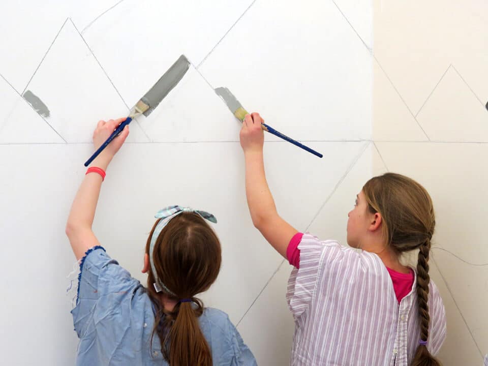 Given the range of stories that may be told in this area, students were asked to consider a design idea that was timeless, open-ended, and could serve as a background for any story. The classroom mural is a combination of ideas presented by the fourth grade students. Using latex paint, students first created a base coat in each area of the design. Next, they applied details and textures using various techniques using brushes, crumpled paper, and cloth.