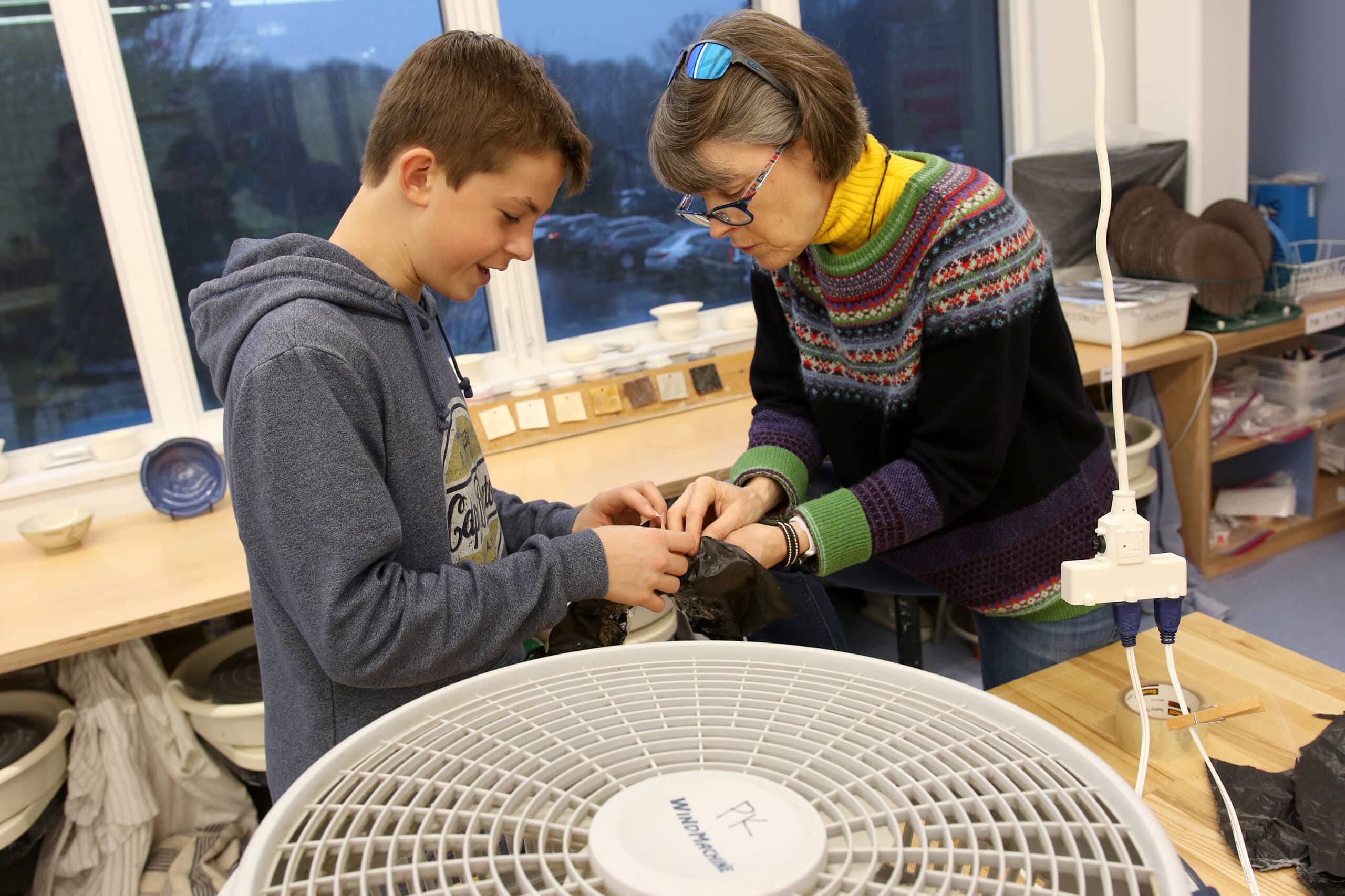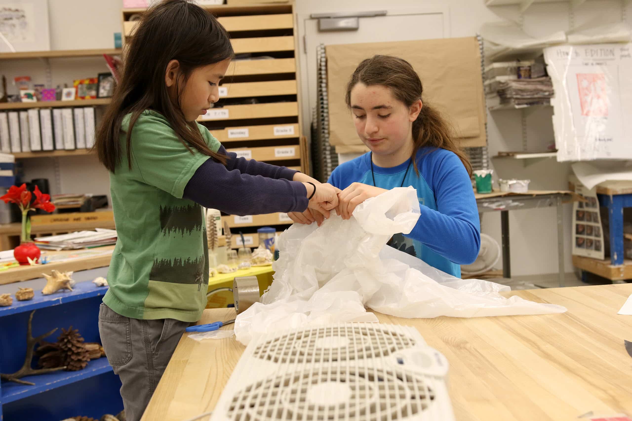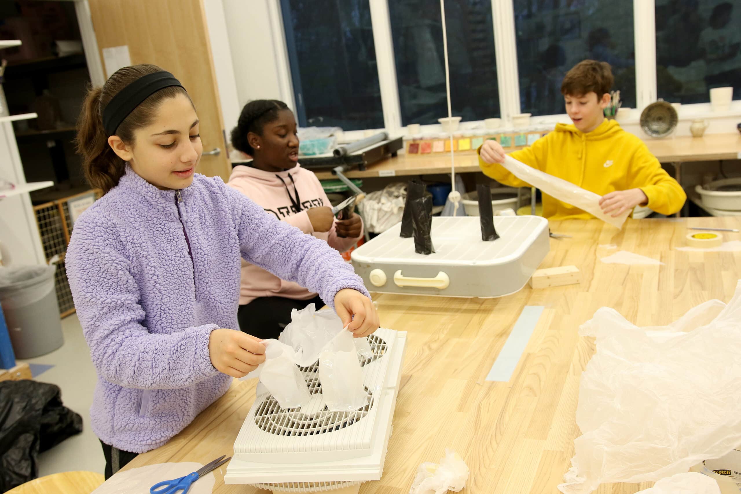 Seventh and eighth grade students in the Kinetic Sculpture arts elective class are currently exploring how to use air as an integral component in their sculptural work. Students began the term by investigating various types of sculptures they had seen in person, which included local examples of free-standing sculptures (such as the statue of Paul Revere on horseback near Old North Church), and relief sculptures (Robert Gould Shaw and the 54th Regiment Memorial across from the Massachusetts Statehouse). In contrast to those examples, kinetic sculptures are designed and built to incorporate movement. After creating a small-scale wire sculpture that included at least three moveable parts, students were inspired by the kinetic sculptures of American artist Joshua Allen Harris. Harris worked on a series of animal sculptures, made from plastic bags, that he positioned over subway grates in New York City that inflated – and deflated – with the passing of the trains below. This week students tried various strategies as they figured out how much air (from a fan)–and how to successfully harness it–to inflate their own sculptural creations.