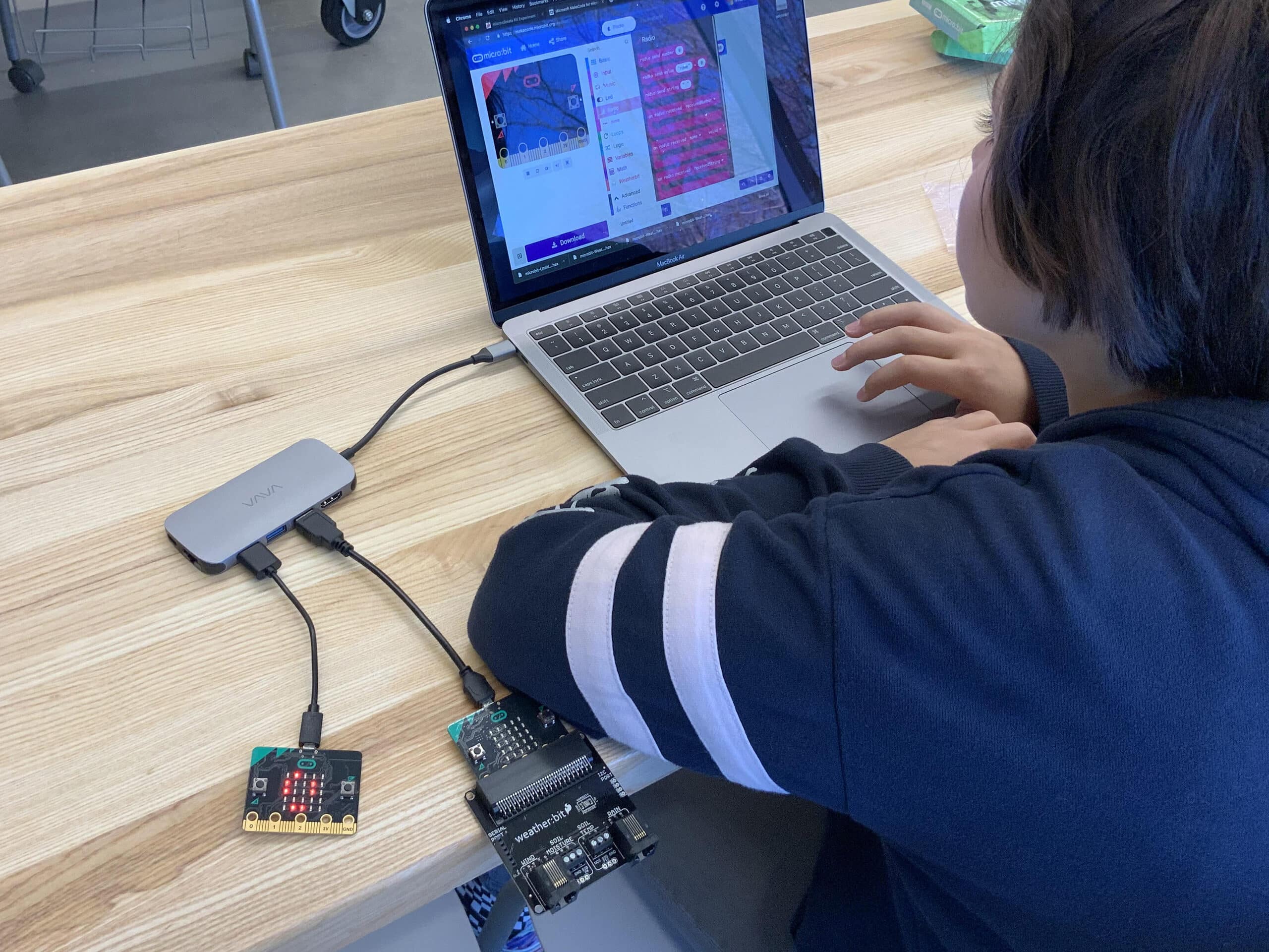 Students in fifth grade have begun programming their final project in technology class. Students are using the Scratch or Microsoft MakeCode programming environments and either a MakeyMakey or micro:bit as a way to interact with their programs beyond just the computer. They are learning how servos work to open and close doors, move wheels for cars, or using a weather:bit to program an alarm clock to wake you up and report the weather outside.