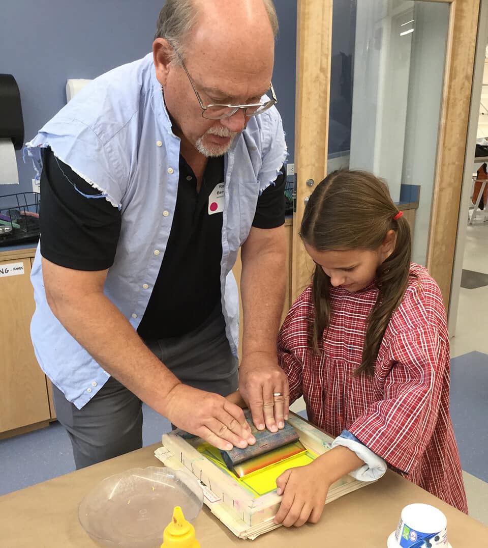 Third grade students are making silkscreen prints in the studio, and today they were lucky to have the opportunity to teach their special visitors about the process in art class. As the grandparents and special friends found out, teamwork is an integral part of this work. Many thanks to our guests for joining in to create prints with the third grade printmakers!