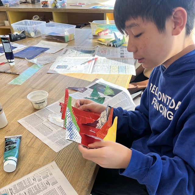 Seventh and eighth graders have been creating handmade, one-of-a-kind books in the bookmaking elective arts class. They worked on several projects that included illustrating and developing a theme or story in an open pamphlet book. They hand-printed paper to cover bookboards, and then sewed these illustrated books together using bookbinding materials. They marbled papers to create an origami folding accordion book. Students also used a variety of printmaking techniques to create a “flag book,” including gelli printing, carving printing plates to make the covers and interior liners that include twelve printed paper shapes that move in a dynamic manner as the book opens and closes. As a final project, some students also used discarded books to make three-dimensional sculptures by repeatedly folding pages in a particular patterned configuration.