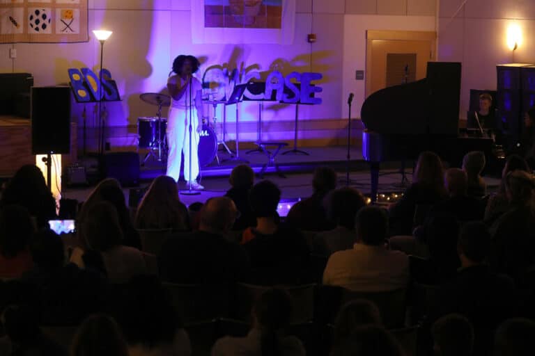 All of this incredible work made for a truly memorable night. As audience members came into the PAC, they immediately noticed colorful lighting, a BDS Showcase signed made by Teacher Conroy’s Innovation Lab class, candles scattered on the stage steps, a flipped orientation of chairs and stage, and could see students bustling about finishing up soundchecks, straightening chairs, and prepping for the performance. As the student musicians took the stage, it was clear that they were prepared and thrilled to stand in front of a full house and share their diverse and wonderful talent and work. The night was completely student-led. Showcasing the learning process and talent of these middle school students in this way felt special and right. Thank you to all who came out to support this event and our students!