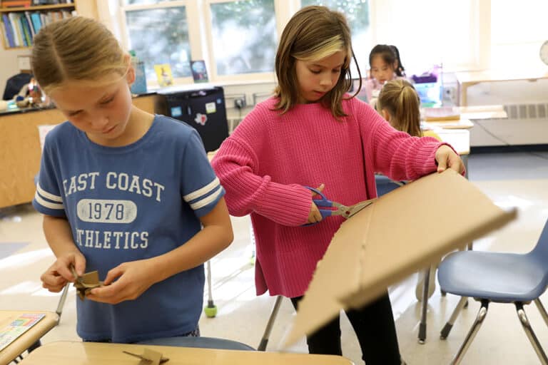 Fourth graders are breaking out the canary knives and cardboard scissors and brushing up on their engineering skills. Next week they will be put into teams and challenged to construct something out of cardboard using the design thinking process. Students will generate ideas, make plans, create and test prototypes, troubleshoot and improve their designs, and eventually share their creations with the school community. What will they be making, you ask? The fourth graders are asking the same question! We will reveal their mission next week. Until then, they are practicing different ways to attach cardboard without using adhesives (and are making some spontaneous, fun creations along the way.)