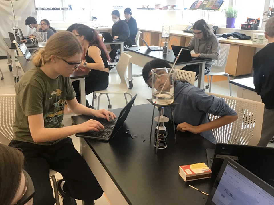 In the second half of their unit on matter and its properties, eighth graders have been looking at the characteristics of the states of matter, changes of state, forms of energy, forces that are responsible for the states of matter, particle theory, and the relationship between heat and temperature. As a culminating activity for this unit, students completed a lab activity in which they used Bunsen burners to heat a sample of ice from solid to liquid to gas. While applying constant heat, students recorded the temperature of the sample every 30 seconds until the sample was fully boiling for five minutes. Students then used Google Sheets to graph their data. Using their graph students were able to develop an understanding of what a heating curve looks like for any substance. They were also able to use their observations as well as the slope of their graphs to determine when phase changes occurred and when the particles in the water gained kinetic energy. This experiment was a highlight of the month as students learned how to light Bunsen burners, worked with partners to record data, and were able to apply math concepts as well as their understanding of the states of matter to the result they obtained in this activity.