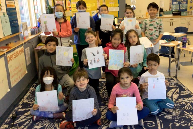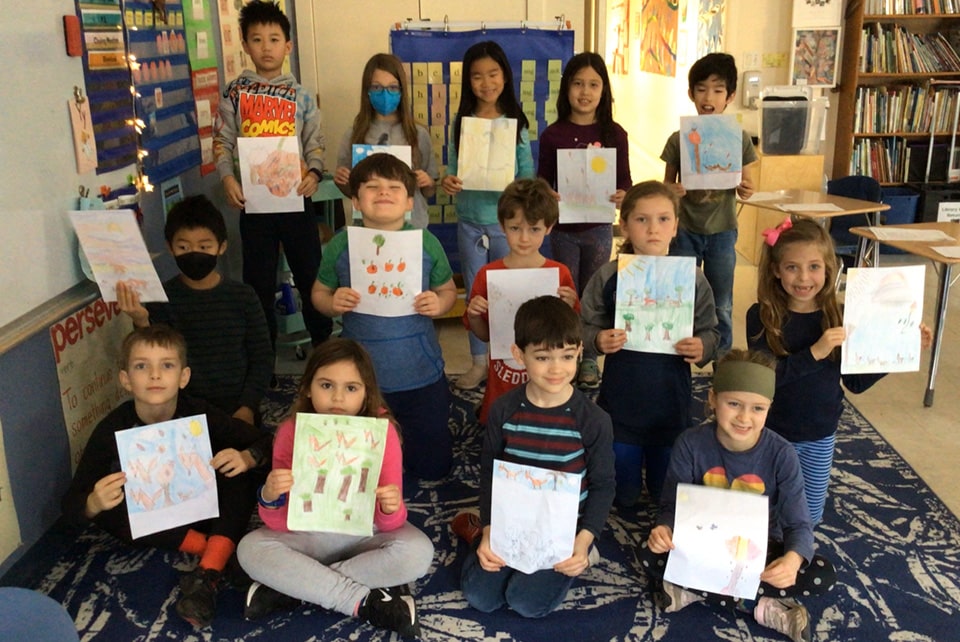 In second grade, the students have been learning and illustrating a poem by Louis Codet. They’re learning a choice of 10 words that they can swap with some words in the poem. They get to choose from that pool of vocabulary to create their own version of the poem and illustrate it.