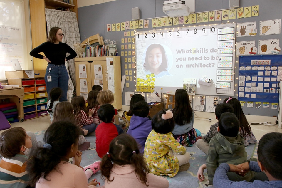 Each year in kindergarten, we welcome student choice by holding an election in which the kindergartners can vote for the community helper they would like to learn about most. This year, our top-three community helpers were veterinarians, architects, and professional dancers. After learning a lot about vets, kindergartners are now beginning to explore what an architect does. We kicked off our study of architects by reading the book Iggy Peck, Architect, and watching a video interview with a real-life architect, Katherine Williams. Students noticed the similarities between the fictional portrayal of Iggy the architect and the information shared by the real-life architect to make some inferences about what is true about being an architect. They determined that all architects design buildings, including schools, skyscrapers, and homes. Kindergartners also learned that all architects use tools to help them in their work. Stay tuned to see how we continue to learn about this important community helper!