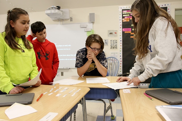 Students in sixth-grade English plunged into the art of rhetoric this week: examining argumentative writing and what makes an argument effective. They began by assessing what they already knew about rhetoric. Students matched terms (thesis, argument, evidence, counterclaim, rebuttal) with definitions and simple questions (e.g. thesis: “what do I think?”) to help them remember each term’s purpose. Students then used their weekend reading–two articles about the College Board’s decision to pare down the A.P. African American Studies curriculum–to argue against or in support of the organization’s choice. Over the course of the week, they practiced writing clear thesis statements and detailed arguments, and they learned to cite a variety of sources to strengthen their positions. Students ended the week by learning about Aristotle’s “Rhetorical Triangle” and infusing their own writing with appeals to ethos, pathos, and logos.
