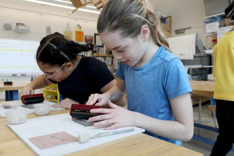 This week in the studio, fifth graders transitioned from making prints with their printing block, which they designed and carved earlier in the year, to impressing their printing block into a clay slab to create an image in bas-relief. Students then carefully added a flange to the underside of the clay, as it will ultimately be a removable lid for their unique clay ‘design cube.’ In the coming weeks, students will work with a partner as they impress several clay tiles, and then attach the tiles together to create the base and walls of their cube. After the cubes and lids have been fired in the kiln, students will finish their ceramic pieces with glaze. Be on the lookout for these treasures from the studio in the coming weeks!