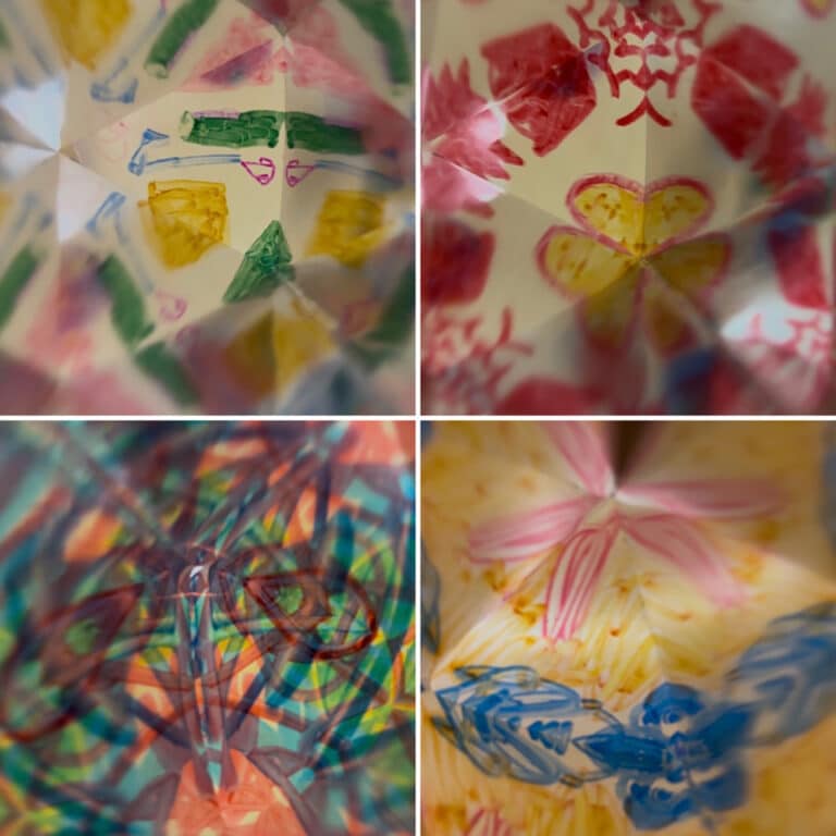 As part of our mathematical study of two and three-dimensional shapes, pre-kindergarten students constructed handmade kaleidoscopes. They used cardboard tubes, mirrored paper, and clear plastic to animate their colorful designs. This project reinforced the names of the shapes we learned, introduced the concept of reflective symmetry, and inspired awe and wonder for our youngest learners.
