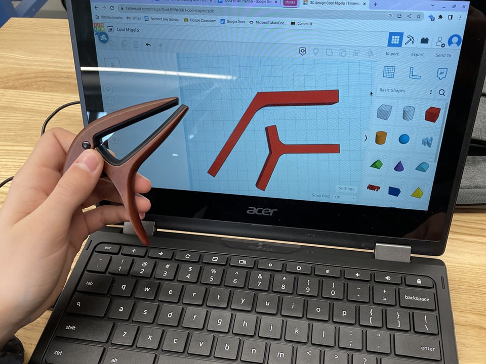 Students in the grades seven and eight technology arts elective are learning how to use the tools in the IMPACT lab to make objects that will help others in the school. Several students are designing iPad holders to replace the current ones that are used in the library for book checkout. Students are also using the 3D design software Tinkercad to create extra guitar capos for music class. The class is greatly enjoying the fact that their new programming and design skills will have a direct impact by helping their teachers and fellow students at BDS.