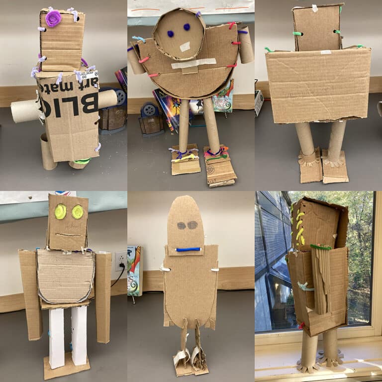 This fall, the fourth graders read The Wild Robot by Peter Brown and completed a cross-curricular project involving science, innovation, and writing. The novel is about a robot named Roz who finds herself on an island and has to adapt to survive. The book allows for rich discussions about acceptance, inclusion, forgiveness, and helping others. In the book, Roz camouflages herself to get to know the island and its inhabitants (animals), so we decided to build our own versions of Roz so she could learn about our BDS community. This process began in science class where the students learned about cardboard engineering and how to connect cardboard structures without using tape or glue. They learned how to create folds, slots, flanges, and tabs to hold their creations together.