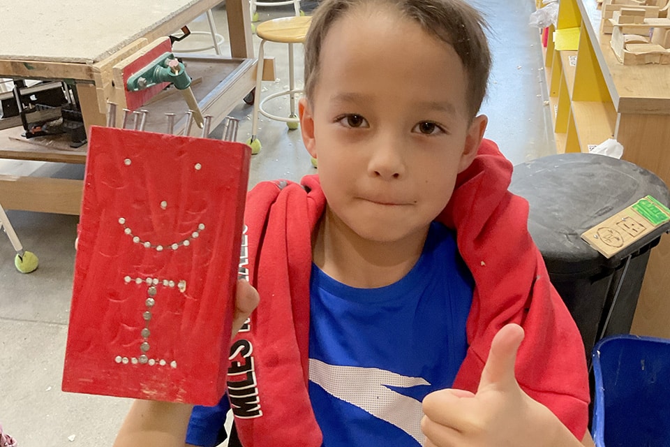 Over the past few weeks in woodworking, the first and third graders have been learning a variety of new skills. The first graders picked up their hammers with enthusiasm and used their new skills to create Happy Blocks. They painted the block and then hammered nails to create the likeness of a happy face. The third graders are taking it up a notch or two this fall and have designed robot creatures. The students started by making drawings of their creatures and then created a collage to represent the different parts to make with wood. Finally, the third graders brought their robot creatures to life by cutting and assembling them in wood.