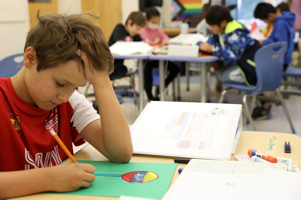 Fifth graders are practicing their factorization skills by creating posters that showcase different strategies for finding the factors of a given number. Utilizing either the “lollipop” or “rainbow” method, students used their multiplication skills to break numbers apart into their composite multiplication equations. These colorful posters help anchor these core concepts more deeply in students’ minds and serve as a resource for future factor problems.