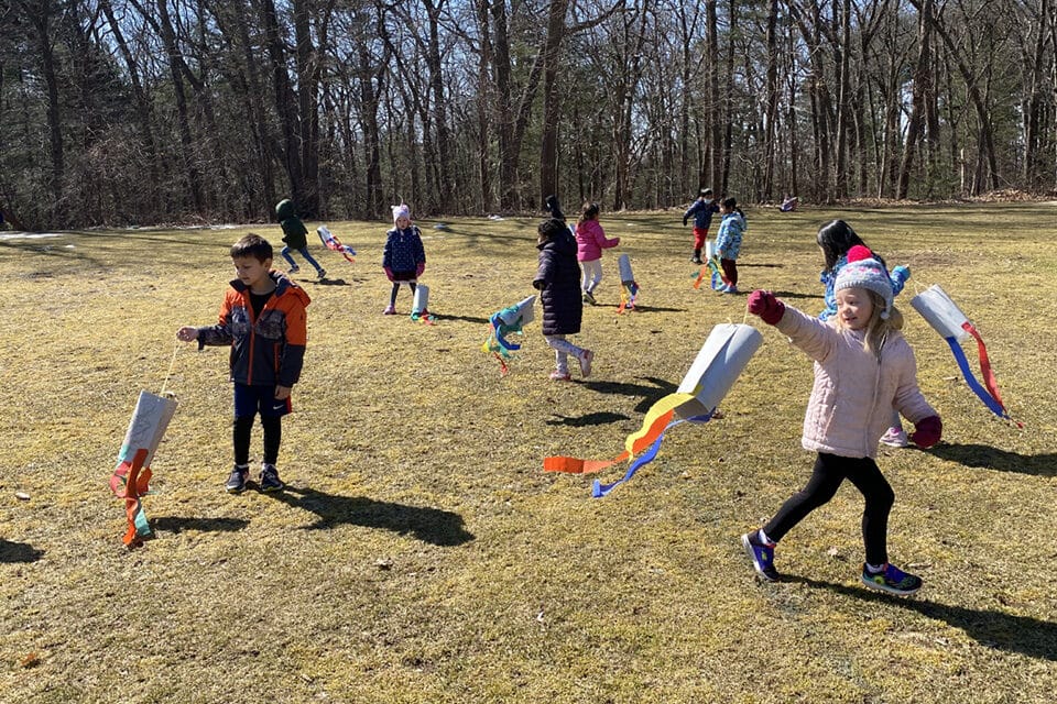 Over the past two weeks, our pre-kindergartners have been learning about wind and clouds. We began by reading books about wind to learn what wind can do and how it changes. In the classroom, we used fans to experiment with different objects to determine what makes something easy for the wind to move. During our woodland walks, we collected natural materials and predicted which would be blown by the wind and which would not. Then we tested the natural objects. We learned that a light wind is known as a “breeze” and a big wing is known as a “gust’ or “gale”. We also created windsocks which we tested out on Claflin Field.