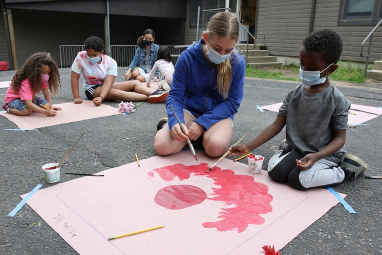 Although Rob and Chris are no longer at BDS, one of the long-standing projects that has lived on, with the exception of the last two years of the pandemic, is painting of Georgia O’Keeffe-inspired flowers. Indeed, this project dates back so far that Beckie located and brought in her own “big flower” that she once painted with her sixth grade partner many years ago! Each year, the kindergartners and sixth graders gather together to paint an oversized flower to mimic the style and technique that were the trademark of Georgia O’Keeffe. First, the partners choose a real flower from a large bouquet of options. Next, they carefully sketch their chosen flower in pencil. The teachers then help the students find matching paint colors to bring their flower to life as well as a color suitable for a contrasting background. This entails a customized order from each pair such as requests for “a type of yellow like mustard,” “an orange like a tiger’s stripes,” or “a blue that is a little lighter than the color of the sky.”