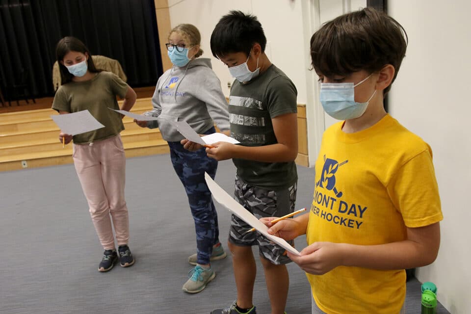 Fifth graders in theater class have been learning about the six elements of voice and vocal projection. Vocal warm-ups were a fun way for students to learn proper breath control and articulation. These set the stage for the students to take on challenging tongue twisters. The class next explored the elements of voice (pauses, stressed words, pace, volume, tone, and pitch) while reciting the nursery rhyme, Little Miss Muffet. This week they applied their newly learned vocal skills to color a poem. In small groups, the students worked collaboratively as they decided which elements would most effectively convey the meaning of the poem to their audience. Each group’s performance was unique and engaging!