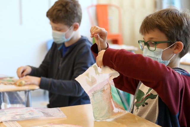 Students in fourth grade art class just completed their hand-sewn quilts inspired by an investigation of African American quilting traditions. Students learned about the Gee’s Bend quilting tradition from rural Alabama that began in the 1800s and is still vibrant today. Beginning as a necessity, these fabric artworks have emerged as an American art form. In addition, fourth graders looked at the two surviving story quilts made by enslaved artist Harriet Powers from Georgia. After designing a geometric or figurative quilt, each student used watercolors to tint their fabrics. Cutting shapes and forms they pinned and sewed a quilt top by using needles and thread. Next, they put together the three layers: quilt top, batting layer, and the quilt back. As a final step, they used quilting stitches to bind all the layers together to create one-of-a-kind fabric artworks.