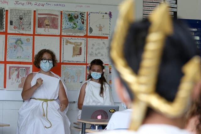 On Thursday, our fourth graders had a hybrid Greek Storytelling Festival with students on campus and parents joining via Zoom. The day began with a slideshow of our Greek Olympics and a message from Zeus and Mt. Olympus. Then families broke up into cohort Zooms and enjoyed hearing some ancient myths rewritten and performed live by the fourth graders. Part two of the celebration happens at home where the fourth graders will share their ancient Greek digital magazine which offers advice from the gods, an interview with a mortal, highlights from the journal of Odysseus, and more! Thanks so much to the kitchen team for providing yummy Greek food, such as spanakopita, for us to try.