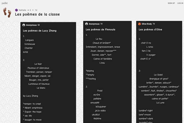 After studying a poem by a Francophone author, it was time for sixth grade French students to create their own poems in different styles. Their “faux-acrostiche” displays the letters of their name included in a word that represents their interests or who they are. For their diamond poems, they had to choose two opposite words and characterize them using nouns, adjectives, and verbs. Language class is driven by the ability to communicate effectively and be understood by one’s peers. The vocabulary used in the poems was either learned in class or researched with an online dictionary. In this latter case, the students were required to create a glossary.