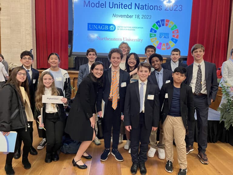 On Saturday, November 18, thirteen Belmont Day middle school students participated in a Model UN Conference at Northeastern University. These students were “delegates” of Brazil, Afghanistan, Albania, the Bahamas, Jamaica, New Zealand, Australia, and Chile. During the middle school clubs period, they worked hard to research their country and the issues they were preparing to discuss. They joined 450 middle school students from many schools around New England as they discussed important world issues and worked to pass resolutions to solve global problems. The issues our students grappled with at this particular conference: