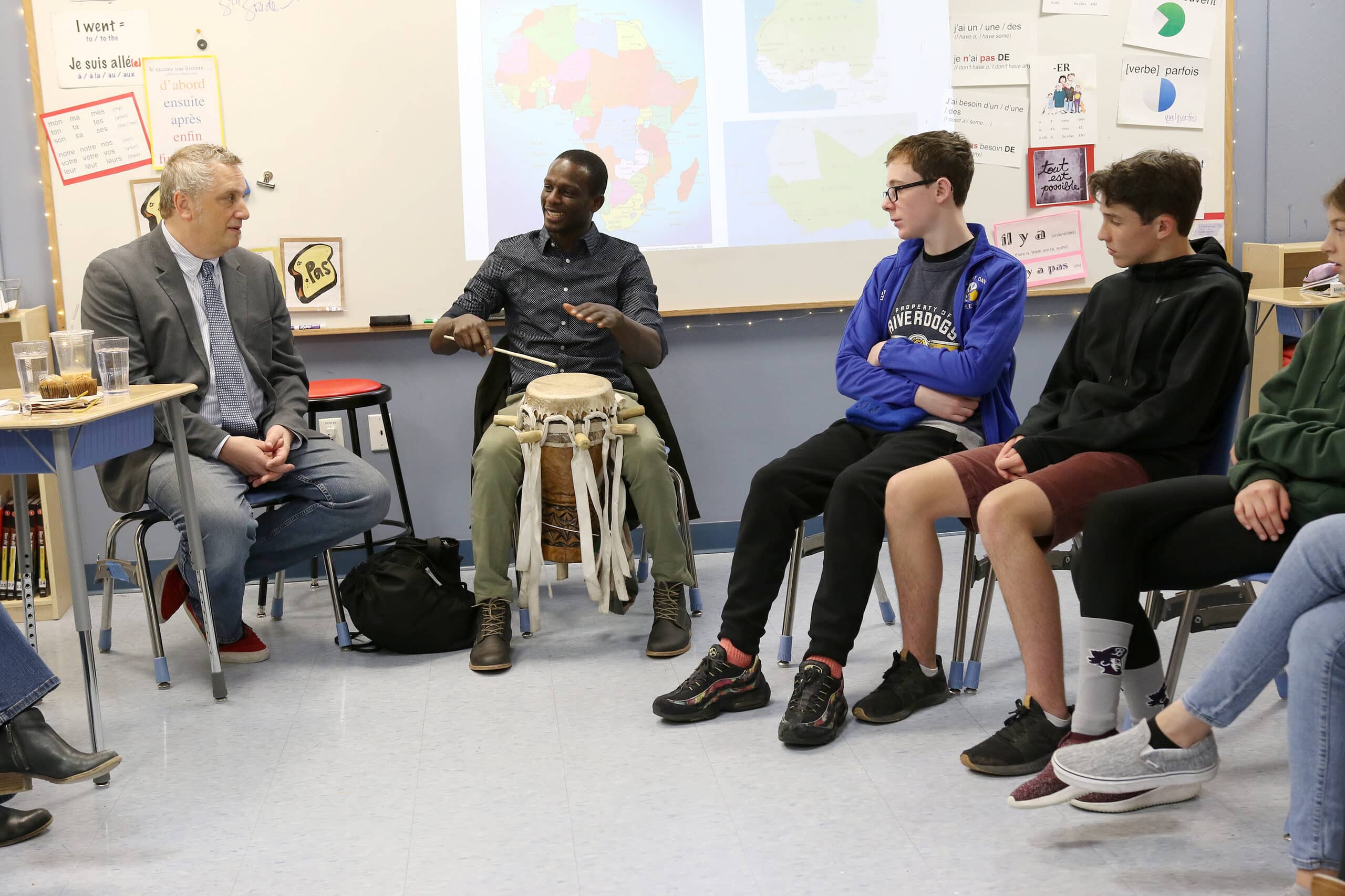 Madame Friborg’s grade 8 French class had a special visit on Tuesday, November 19 from Malick Ngom, a Sabar drummer from Sénégal. Ngom is from a griot family in Sénégal and has been playing drums all his life, inheriting a centuries-long tradition of drumming and dance as central to daily life. He was a dynamic presenter who inspired the whole class. An associate of fourth grade parent Dan Cantor, Ngom discussed his cultural background, played the drums for the class, and even got students and faculty on their feet dancing. His specialty is in the use of the Sabar drum, but he also plays other drums such as Djembe, Djundjun, and he is a member of two bands, one international jazz and the other, Afro-Celtic. Ngom teaches locally at the Studio at 550 in Central Square., Cambridge.