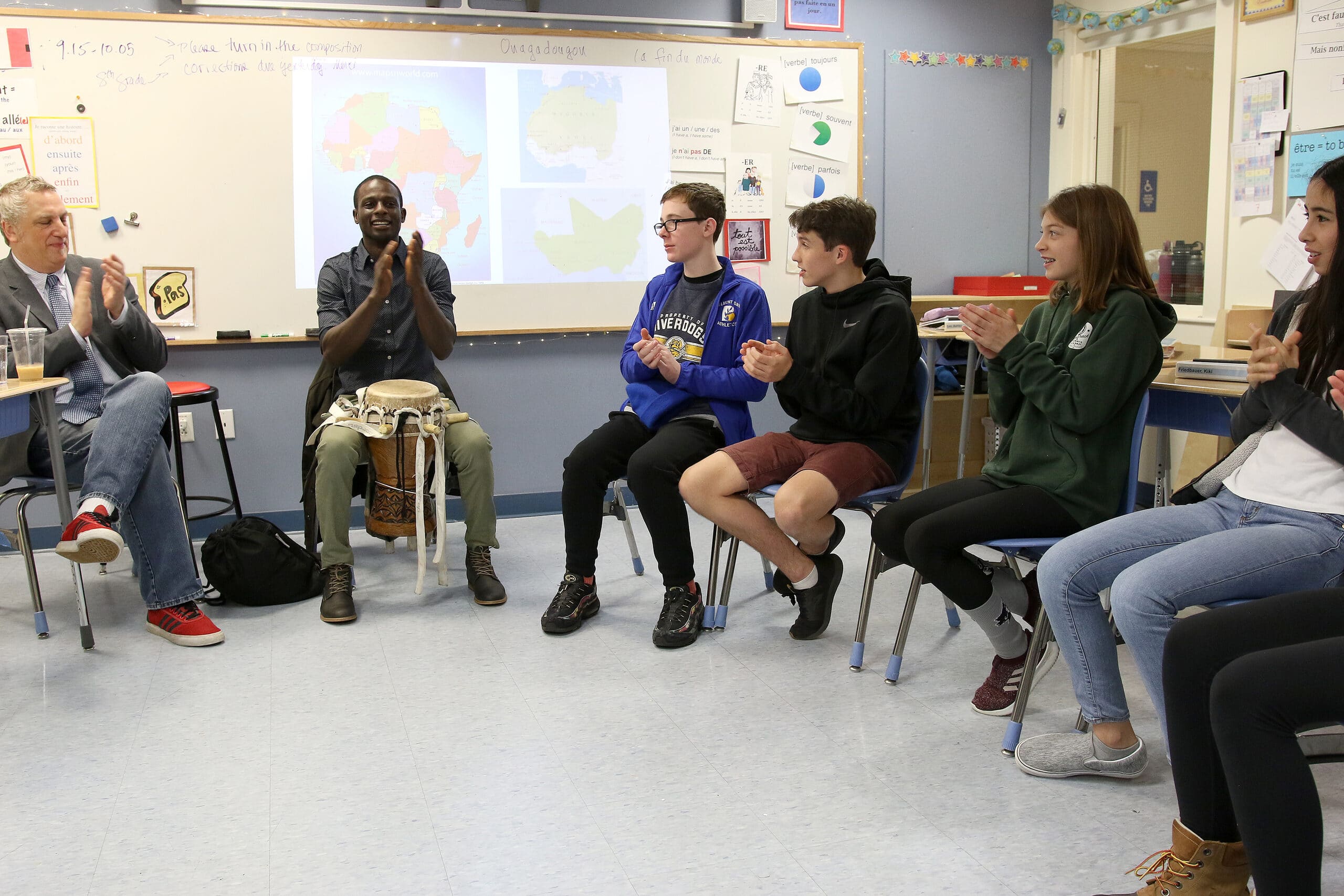 Madame Friborg’s grade 8 French class had a special visit on Tuesday, November 19 from Malick Ngom, a Sabar drummer from Sénégal. Ngom is from a griot family in Sénégal and has been playing drums all his life, inheriting a centuries-long tradition of drumming and dance as central to daily life. He was a dynamic presenter who inspired the whole class. An associate of fourth grade parent Dan Cantor, Ngom discussed his cultural background, played the drums for the class, and even got students and faculty on their feet dancing. His specialty is in the use of the Sabar drum, but he also plays other drums such as Djembe, Djundjun, and he is a member of two bands, one international jazz and the other, Afro-Celtic. Ngom teaches locally at the Studio at 550 in Central Square., Cambridge.