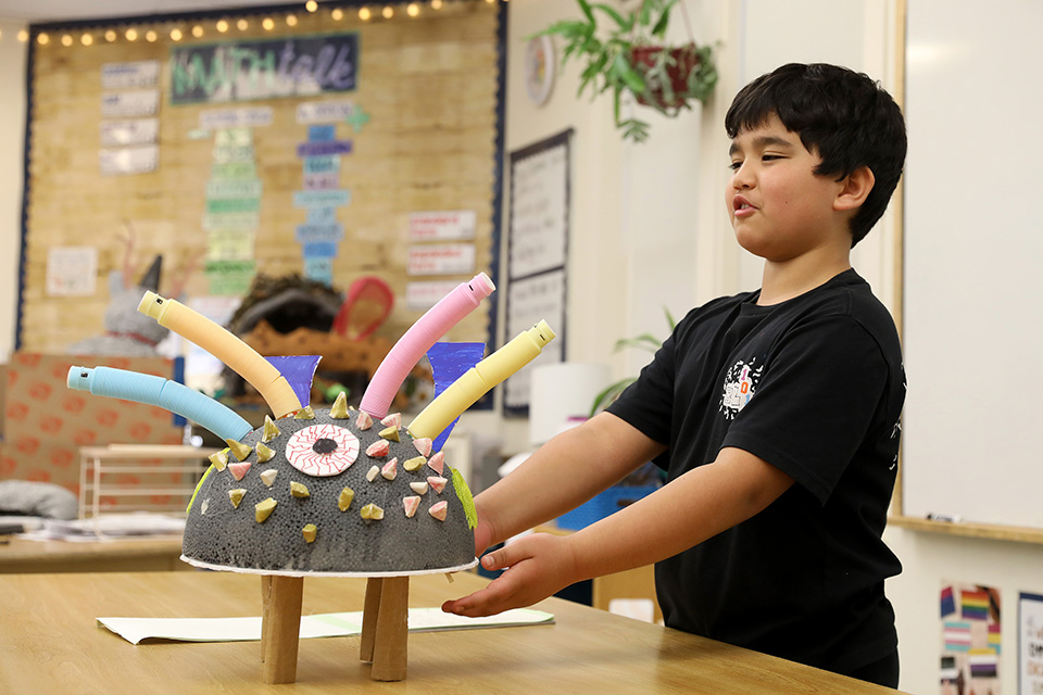 Third graders have been learning about the physical and behavioral adaptations of animals. As their culminating project, students designed and constructed an animal species using their knowledge of adaptations and their own creativity. Some criteria included structural adaptations that allowed for an offense or defense against predators and instinctive behavioral adaptations, such as camouflaging to hide from a predator or burrowing underground during hibernation. Students also needed to consider their animal’s place within a food chain, its lifecycle, and a habitat suited for its ecosystem. Our third grade zoologists presented these new species to their classmates in person as well as virtually to family members near and far.