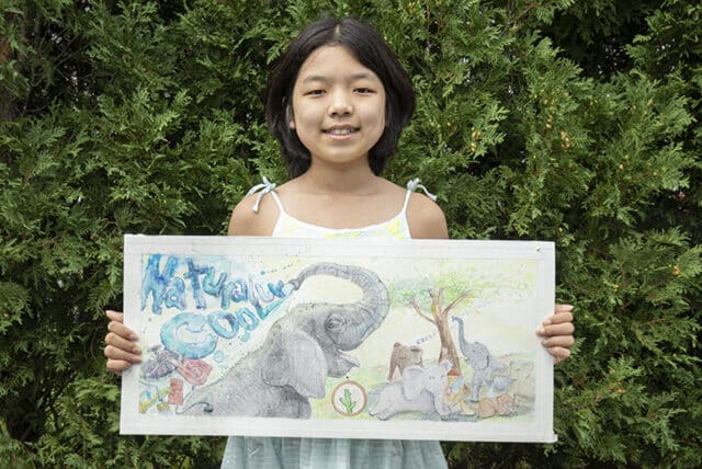 Juliana was one of the winners in the Cool Science art contest sponsored by the University of Massachusetts-Lowell. The contest, for students from kindergarten to twelfth grade, encourages young artists to combine science and art to create displays that illustrate concepts such as heat transfer, energy, and extreme weather. The winning artwork will appear as posters on local mass-transit in the state with the goal of educating riders on climate change. Juliana’s winning piece entitled, “Naturally Cool,” shows elephants trying to keep cool in extreme heat and the impact of human use of electronic means to stay cool.